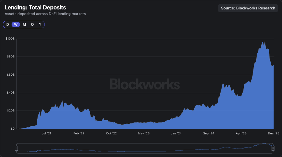 Amid the downtrend, don’t lose sight of the bigger picture, and take a moment to appreciate just how far we’ve come. At the bear market low, lending applications within DeFi accounted for just $5 billion in deposits, a rounding error within the larger financial system. In the years since, this figure has grown to $71 billion in deposits, having just previously tagged near $100 billion.
