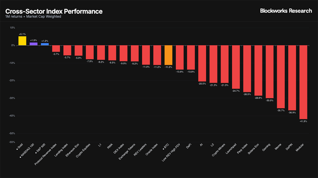 Zooming out to the monthly, the picture remains unfavorable. TradFi benchmarks like Gold, Nasdaq and the S&P 500 are all green over the past month, while every crypto index we track is measuring negative returns.