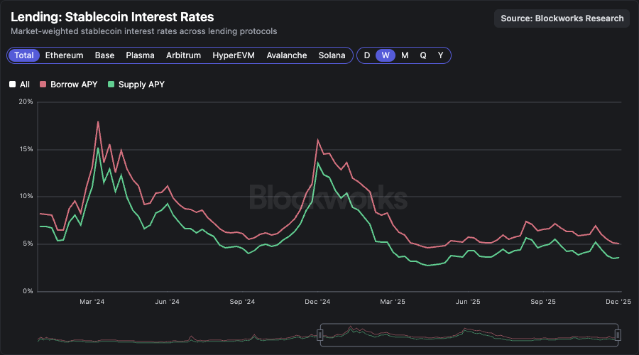 Notably, continued growth in the stablecoin supply comes amid very modest onchain yields. Benchmark supply rates on lending applications are reading 3.6%, a discount to SOFR at 3.9%. Growing depth in onchain stablecoin liquidity may continue to dampen the upside in supply rates, and absent a material risk premium to legacy rates, growth in stablecoin utilization on money markets may falter.